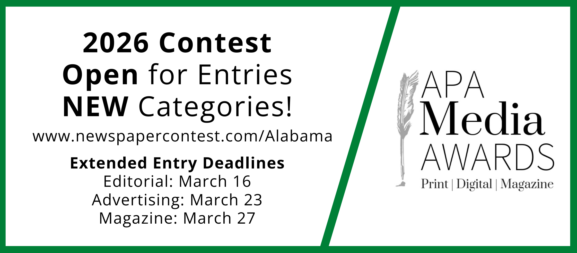 The Alabama Press Association is partnering with the A-Mark Foundation to present the A-Mark Prize for Investigative Journalism with $15,000 in prize money. The A-Mark Prize for work produced in 2025 will be awarded in June 2026, as part of the APA’s annual awards.